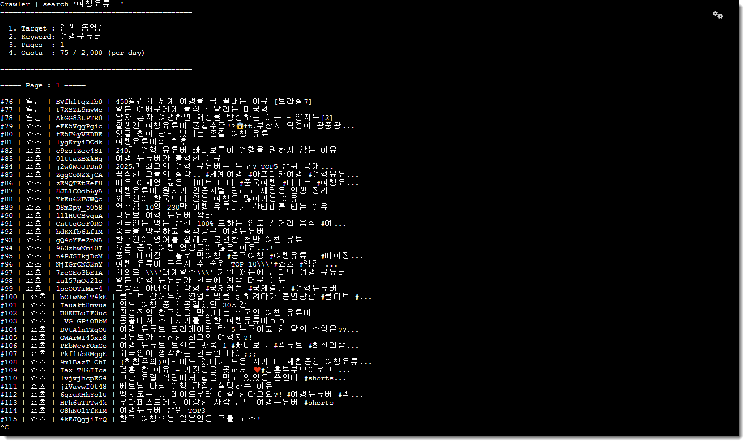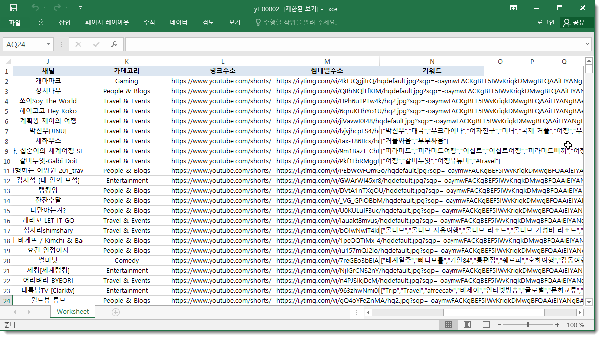 - 조회수, 좋아요, 댓글수, 채널 구독자수, 채널, 제목, 영상시간, 등록일, 카테고리, 키워드, 링크주소 썸네일주소